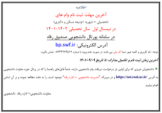9713 مهلت ثبت نام وام هاي دانشجويي نيمسال اول سال تحصيلي 1402 - 1401 شناسه : 5172299