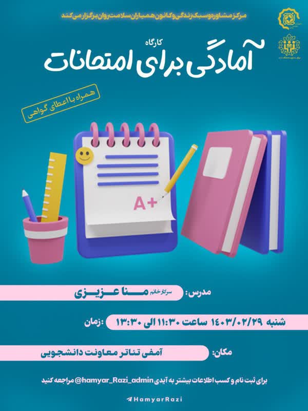 41779 مرکز مشاوره و سبک زندگی با همکاری کانون همیاران سلامت روان برگزار میکند: کارگاه: آمادگی برای امتحانات مرکز مشاوره و سبک زندگی دانشگاه با همکاری کانون همیاران سلامت روان سلسله کارگاه های...