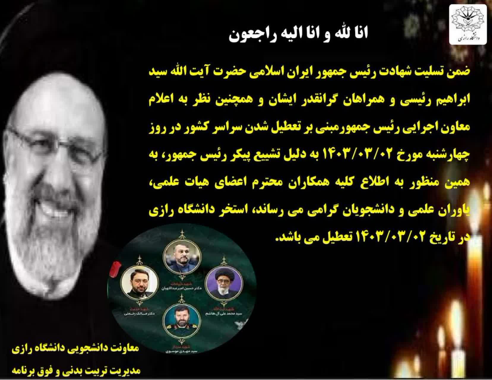 29072 إِنَّا لِلَّٰهِ وَإِنَّا إِلَيْهِ رَاجِعُونَ اطلاعیه تعطیلی استخر ضمن عرض تسلیت به مناسبت شهادت ریاست محترم جمهور و هیئت همراه، به اطلاع میرساند: استخر دانشگاه در روز چهارشنبه مورخه...
