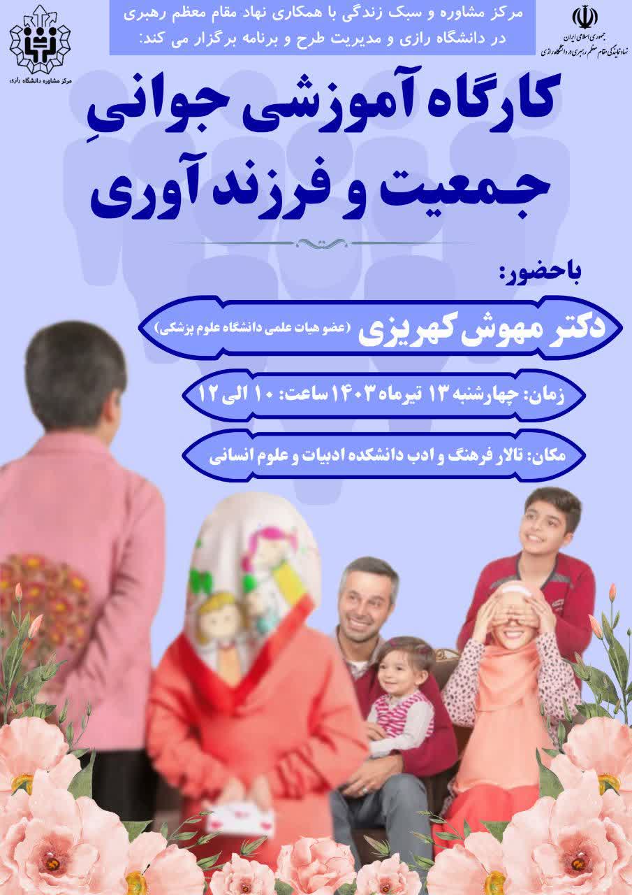 371456 کارگاه آموزشیِ جوانیِ جمعیت و فرزند آوری مرکز مشاوره و سبک زندگی با همکاری نهاد مقام معظم رهبری در دانشگاه رازی و مدیریت طرح و برنامه، کارگاه آموزشی جوانی جمعیت و فرزند آوری را برگزار می کند...