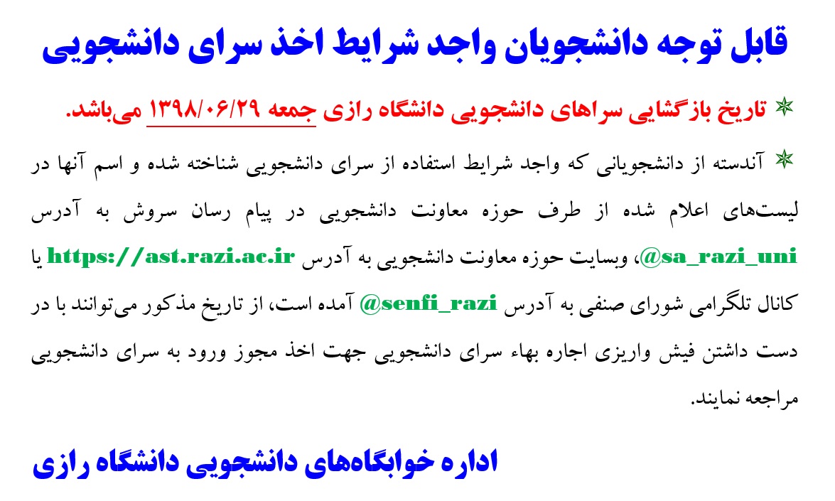 اطلاعیه شماره 3 مخصوص دانشجویان ورودی97 و ماقبل متقاضی اسکان در سراهای دانشجویی