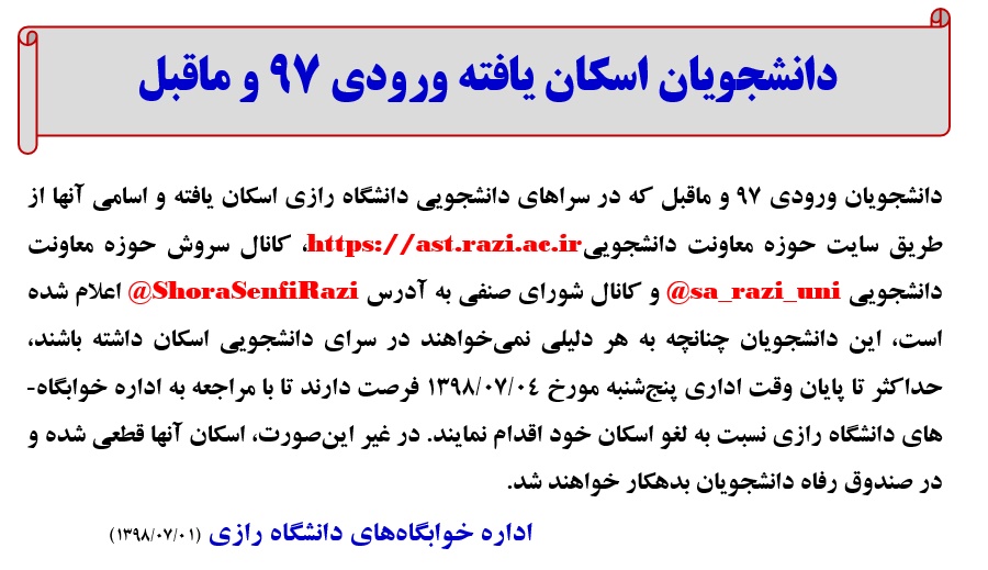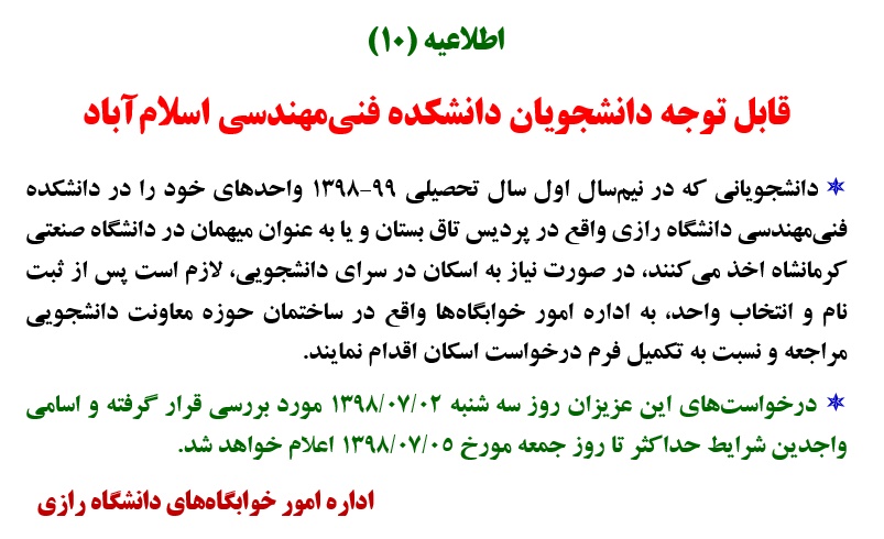 اطلاعیه اسکان: قابل توجه دانشجویان دانشکده فنی مهندسی اسلام آباد