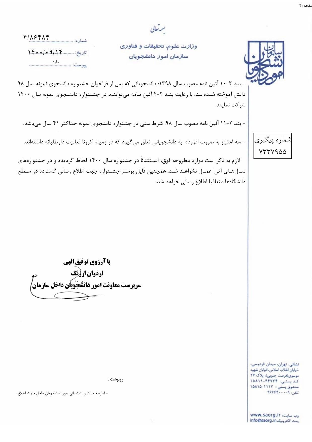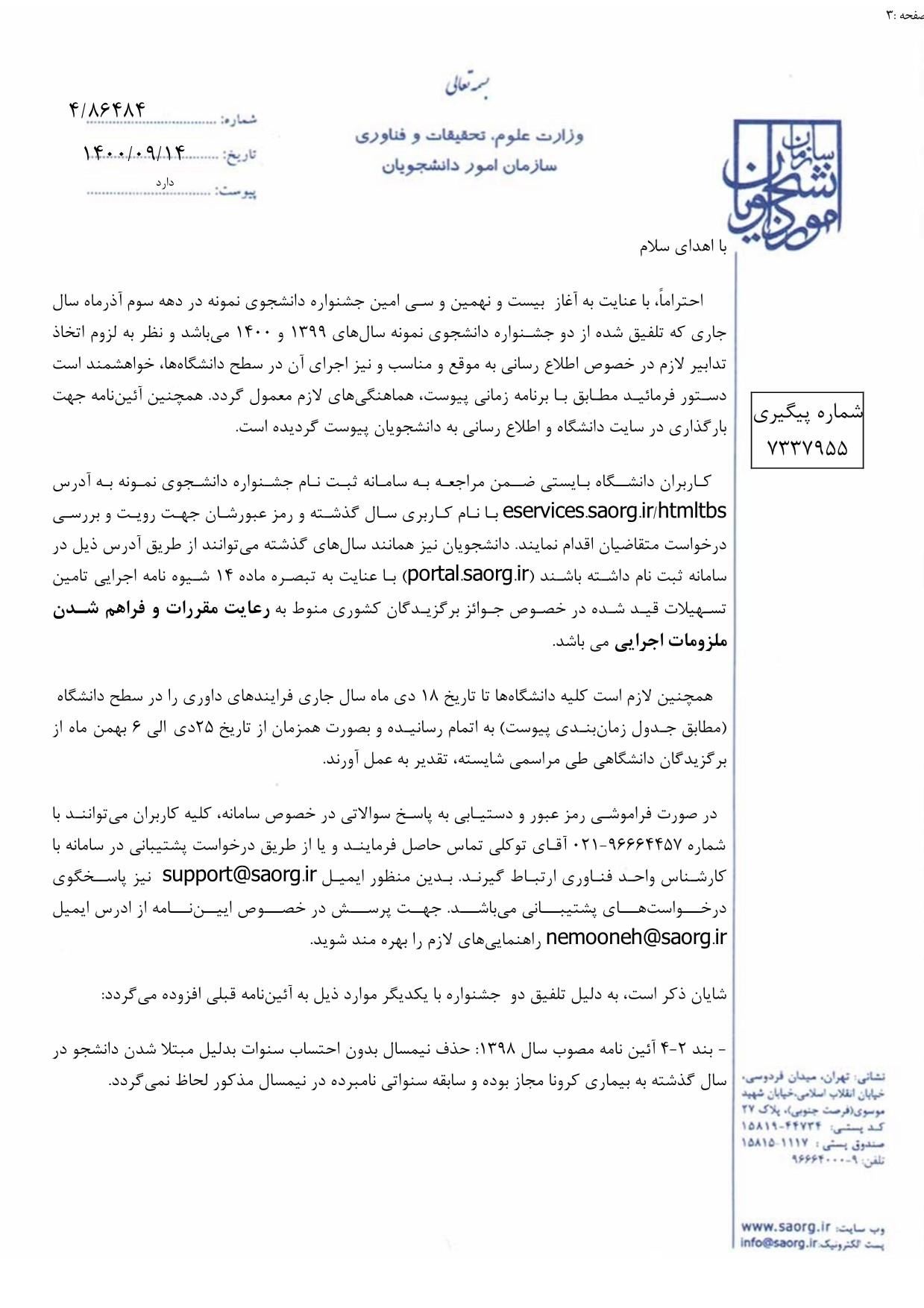 بیست و نهمین جشنواره دانشجوی نمونه دانلود آیین نامه به صورت PDF دانلود شیوه نامه اجرایی به صورت PDF موارد اضافه شده به آیین نامه ۱ موارد اضافه شده به آیین نامه ۲