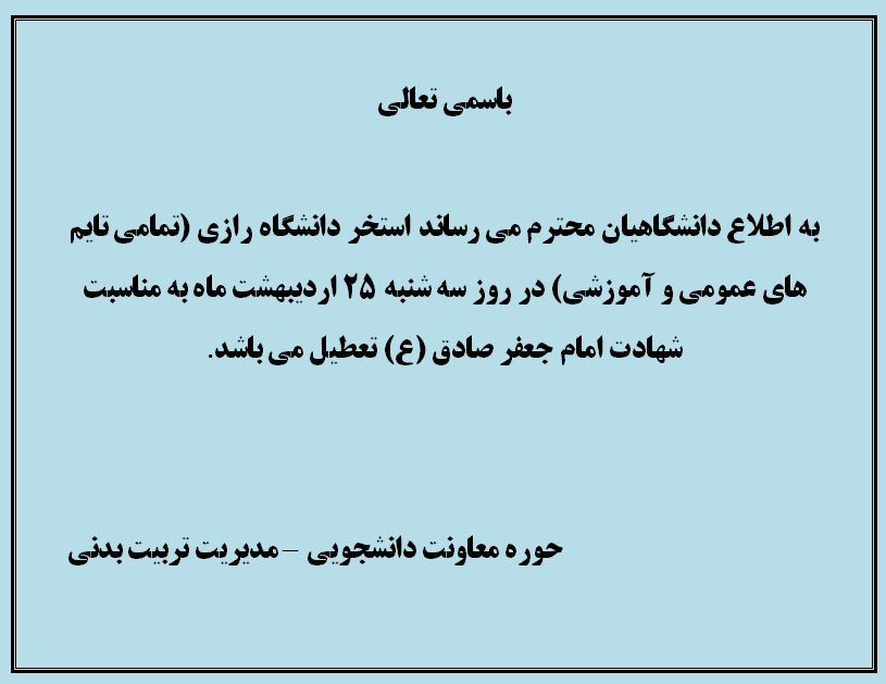 11203 به علت تعمیرات تابستانی و آماده سازی استخر برای آغاز سال تحصیلی جدید تعطیلی استخر دانشگاه از 11 الی 17 شهریور 1402 به اطلاع دانشگاهیان عزیز می رساند: به علت تعمیرات تابستانی و آماده سازی...