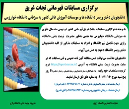 64497 مسابقات قهرمانی کشور در رشته نجات غریق مسابقات قهرمانی کشور نجات غریق دانشجویان (دختر و پسر) دانشگاه ها و موسسات آموزش عالی کشور به میزبانی دانشگاه خوارزمی لینک آیین نامه مسابقات شناسه :...