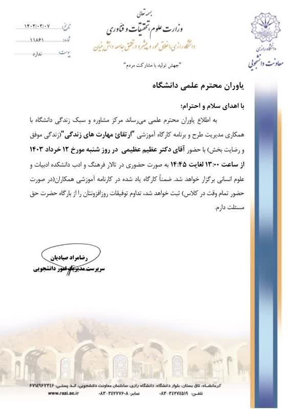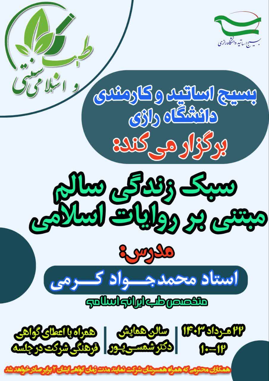 61115 بسیج اساتید و بسیج کارمندی دانشگاه رازی برگزار میکنند: کارگاه «سبک زندگی سالم مبتنی بر روایات اسلامی» 🔹زمان: روز دوشنبه ۲۲ مرداد ماه ۱۴۰۳ 🔹ساعت ۱۰ تا ۱۲ 🔹مکان: سالن اجتماعات پروفسور شمسی پور...
