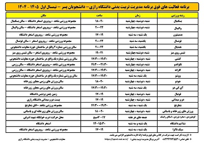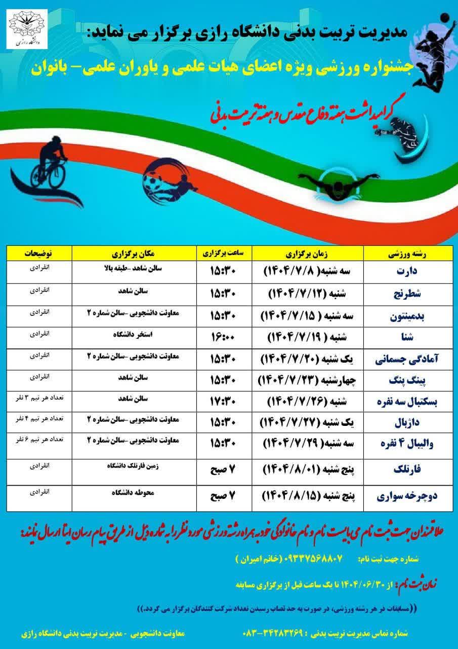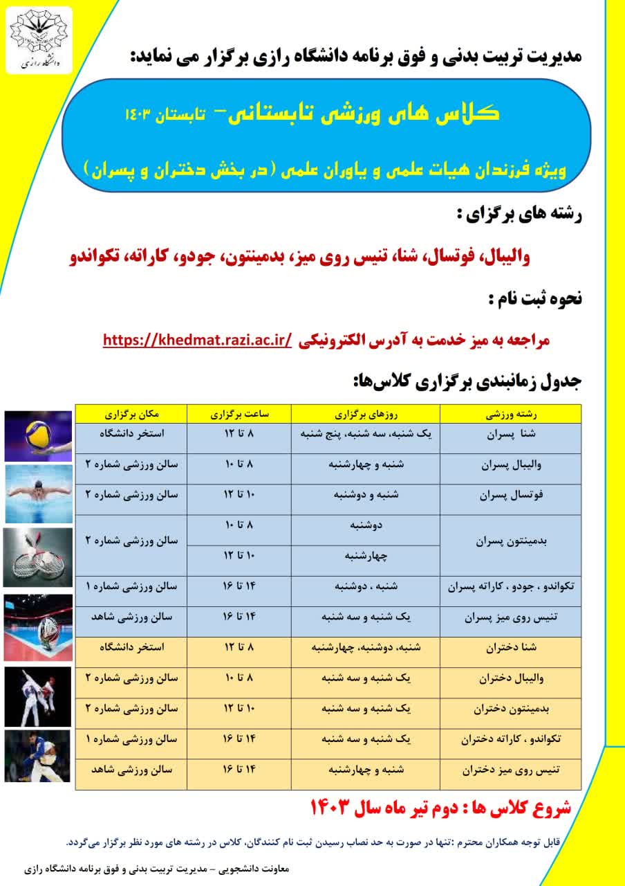 232496 کلاس های ورزشی تابستانی ویژه فرزندان هیات علمی و یاوران علمی(در بخش پسران و دختران) مدیریت تربیت بدنی و فوق برنامه دانشگاه رازی برگزار می نماید: کلاس های ورزشی تابستانی ویژه فرزندان هیات...