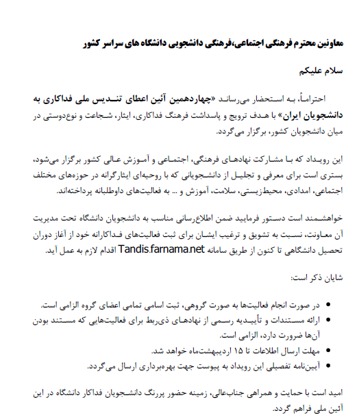 193483 اطلاعیه تعطیلی استخر و فضاهای ورزشی باستحضار میرساند: استخر و فضاهای ورزشی دانشگاه در کلیه ساعات آموزشی و عمومی در روز پنج شنبه مورخ 1403/04/21 به دلیل برگزاری کنکور سراسری در دانشگاه تعطیل...