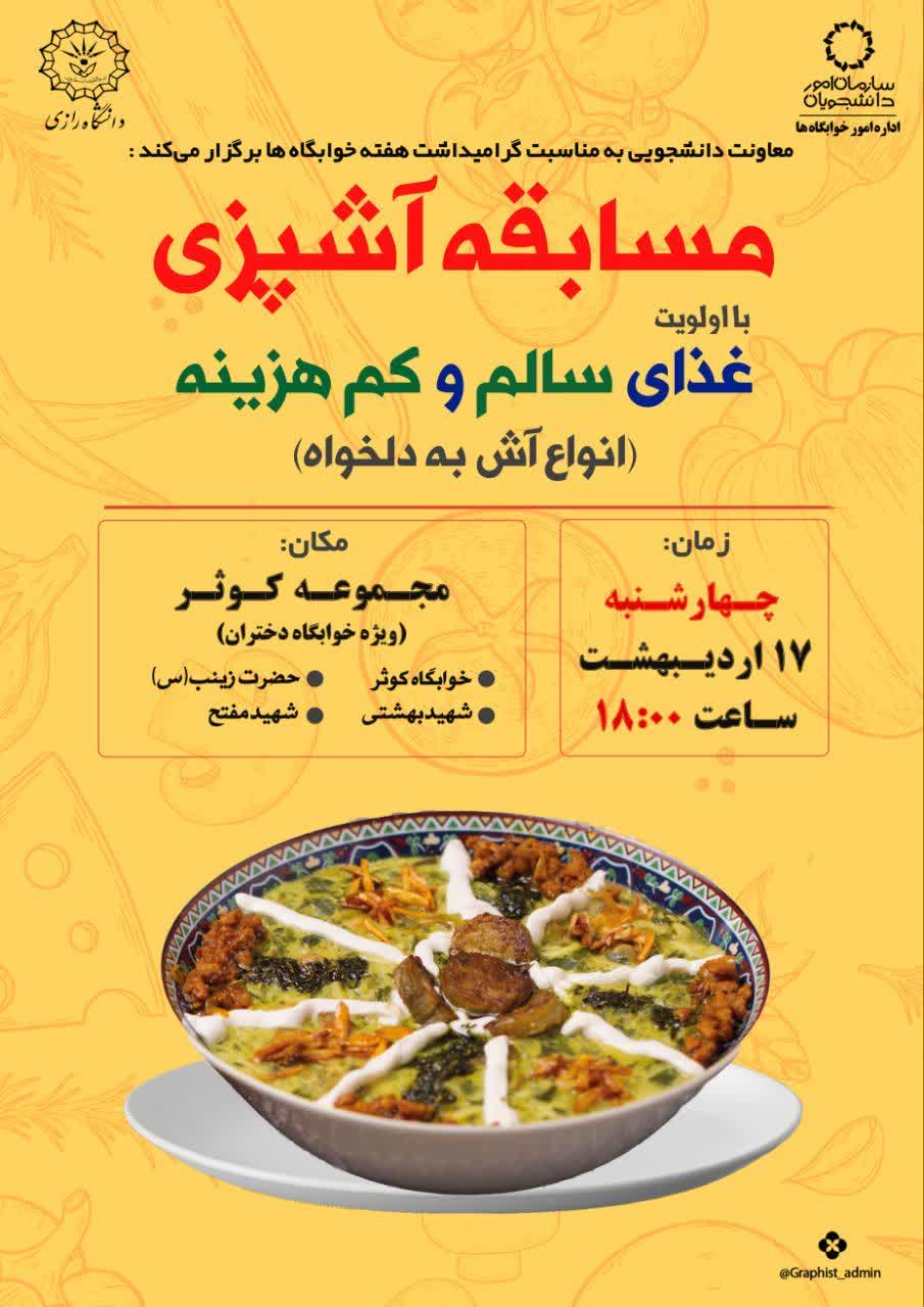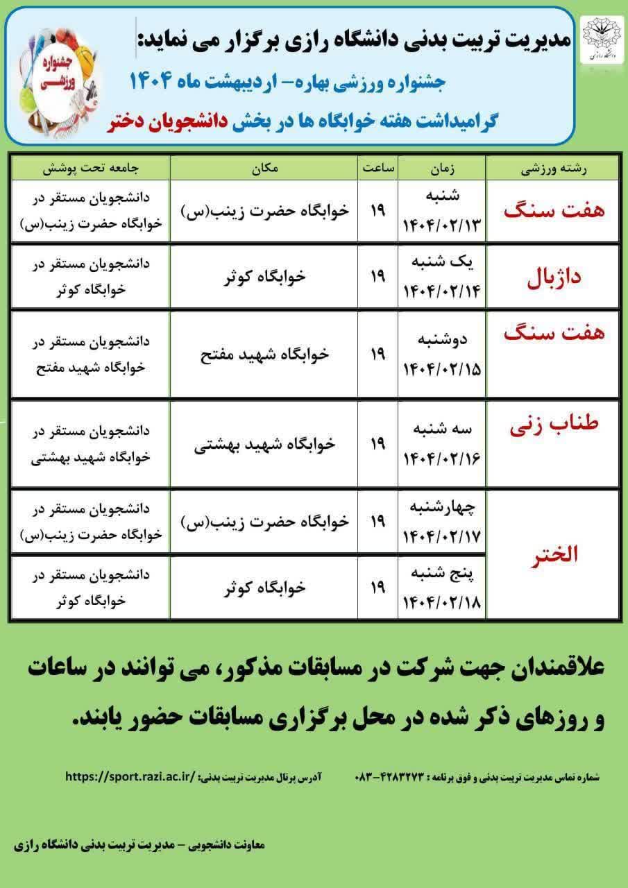 38252 مدیزیت تربیت بدنی برگزار می کند: جشنواره ورزشی بهاره، گرامیداشت هفته خوابگاهها جشنواره ورزشی بهاره، گرامیداشت هفته خوابگاهها در بخش دانشجویان دختر و پسر، در اردیبهشت ماه ۱۴۰۴ برگزار می...